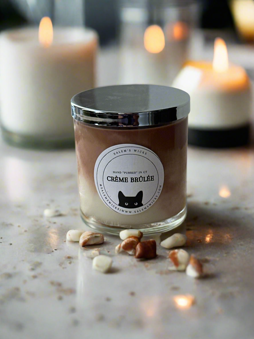 Experience the delicious aroma of our Salem's Wicks Crème Brûlée candle. Indulge in the decadent scent of creamy vanilla and caramelized sugar, reminiscent of the classic dessert. With a large 10 oz size and long-lasting burn time, this candle is sure to fill your home with the irresistible fragrance of crème brûlée.